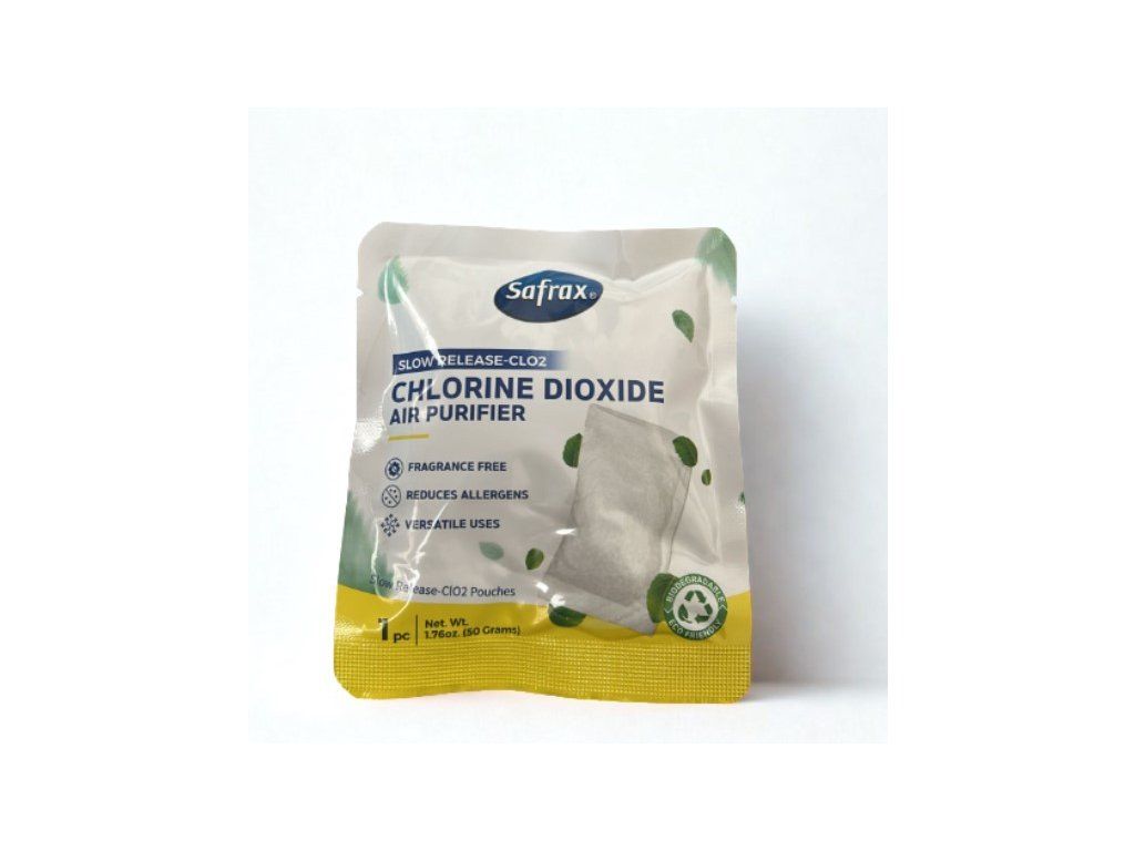 SAFRAX Slow Release Bag je bezúdržbový sáček s postupným uvolňováním oxidu chloričitého (ClO₂), který po dobu 30–60 dní čistí vzduch, eliminuje plísně, bakterie, pachy i škodlivé látky bez parfemace.